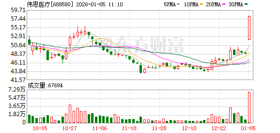 1月5日盘中科创板股伟思医疗涨停,截至09:56,股价报58.08元,成交2.79亿元,换手率5.20%,振幅12.77%。